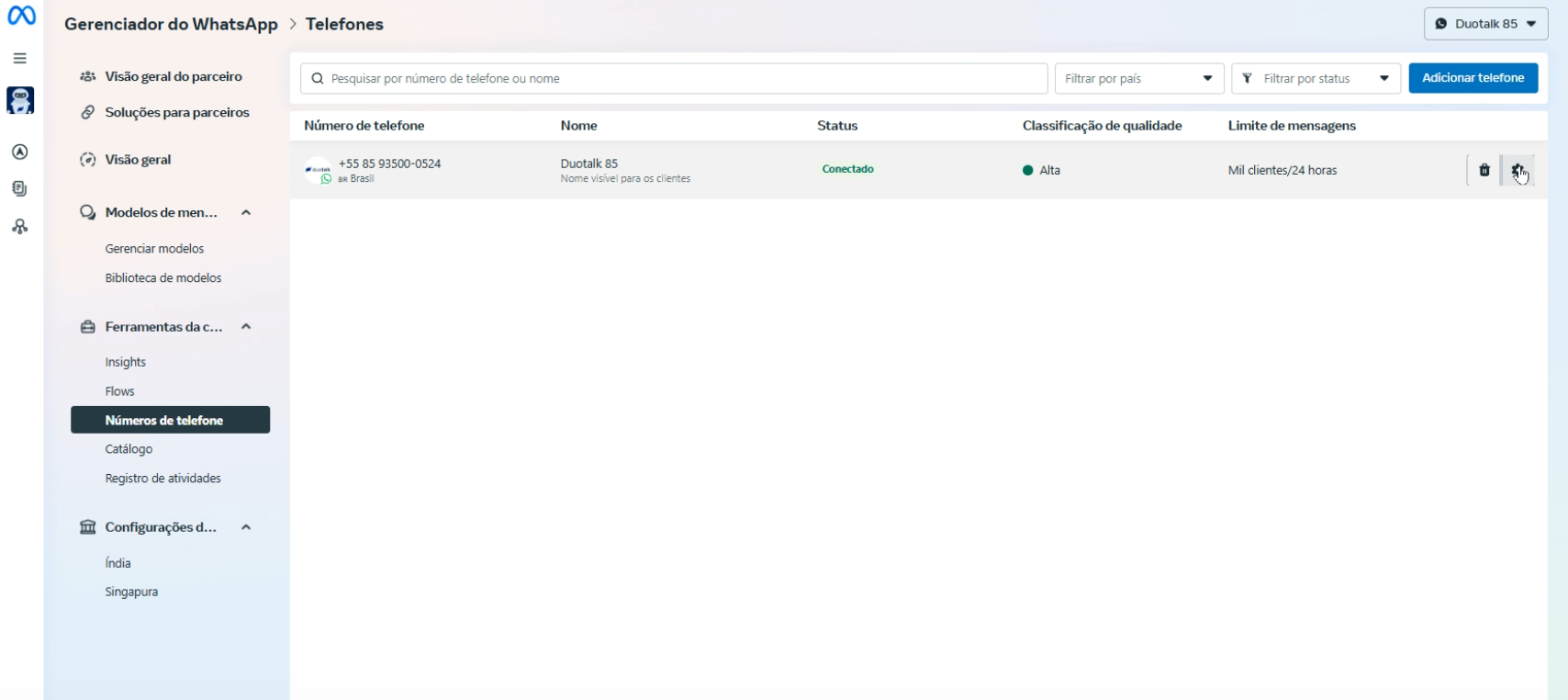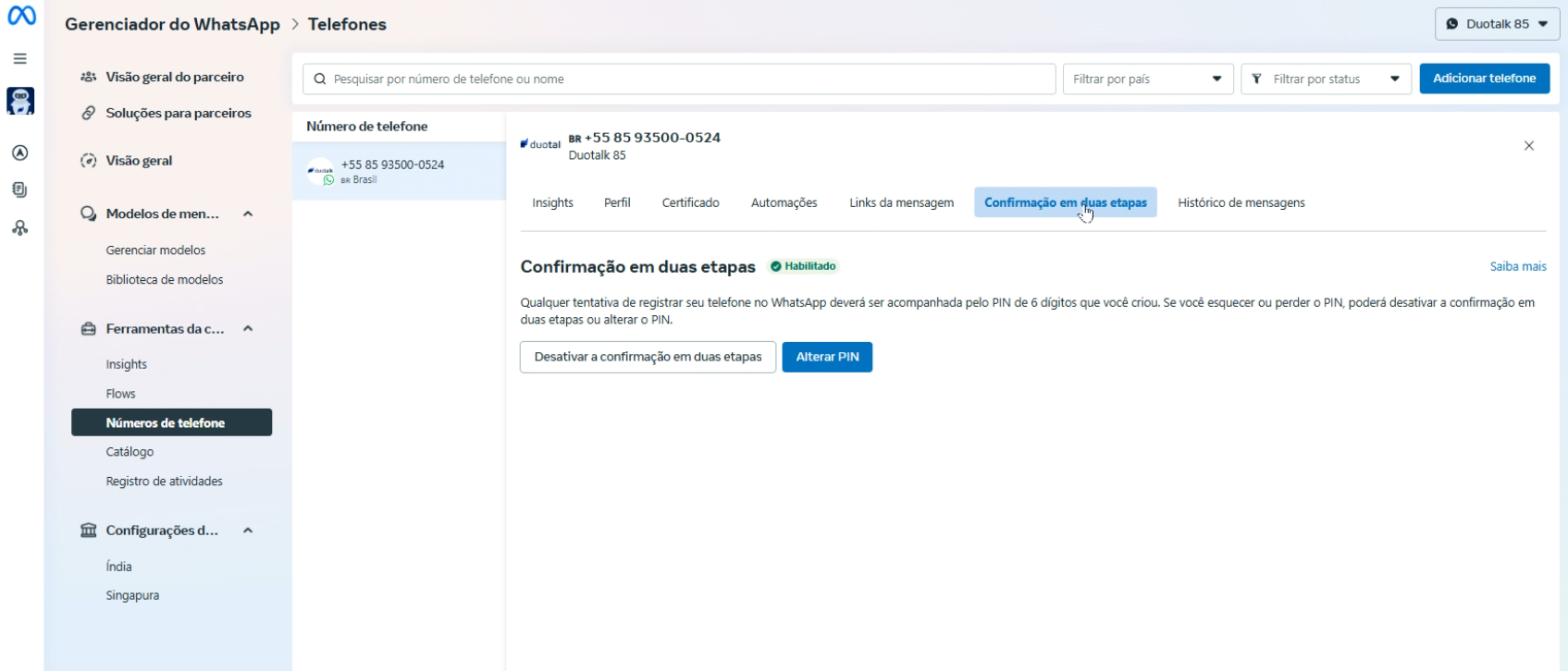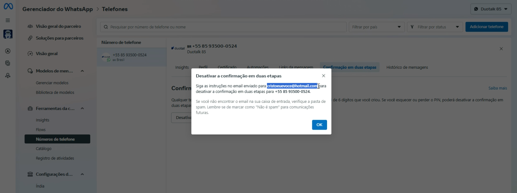 Após selecionar, clique na parte central em Gerenciador do WhatsApp. Depois que carregar, valide se é realmente o número que você quer desabilitar para migração.