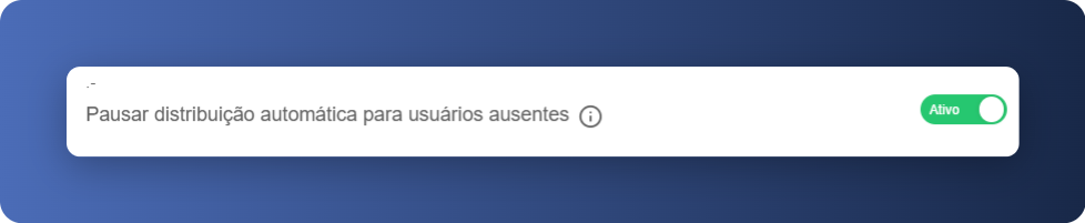 Dentro das configurações da conta, o gestor pode ainda habilitar a opção “Pausar distribuição automática para usuários ausentes”, que impede que operadores inativos recebam conversas. A partir dessa configuração, entram em vigor as regras de atividade, inatividade e status explicadas detalhadamente ao longo deste artigo.