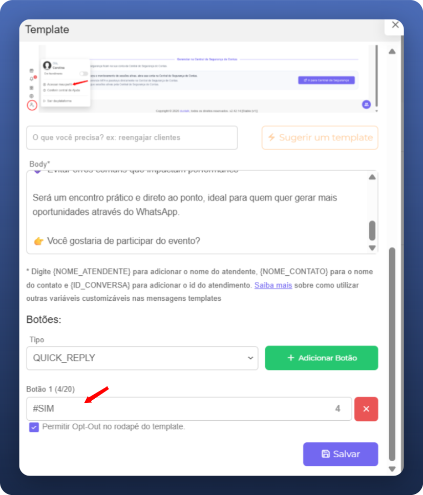No template da campanha, cria um botão de resposta rápida.