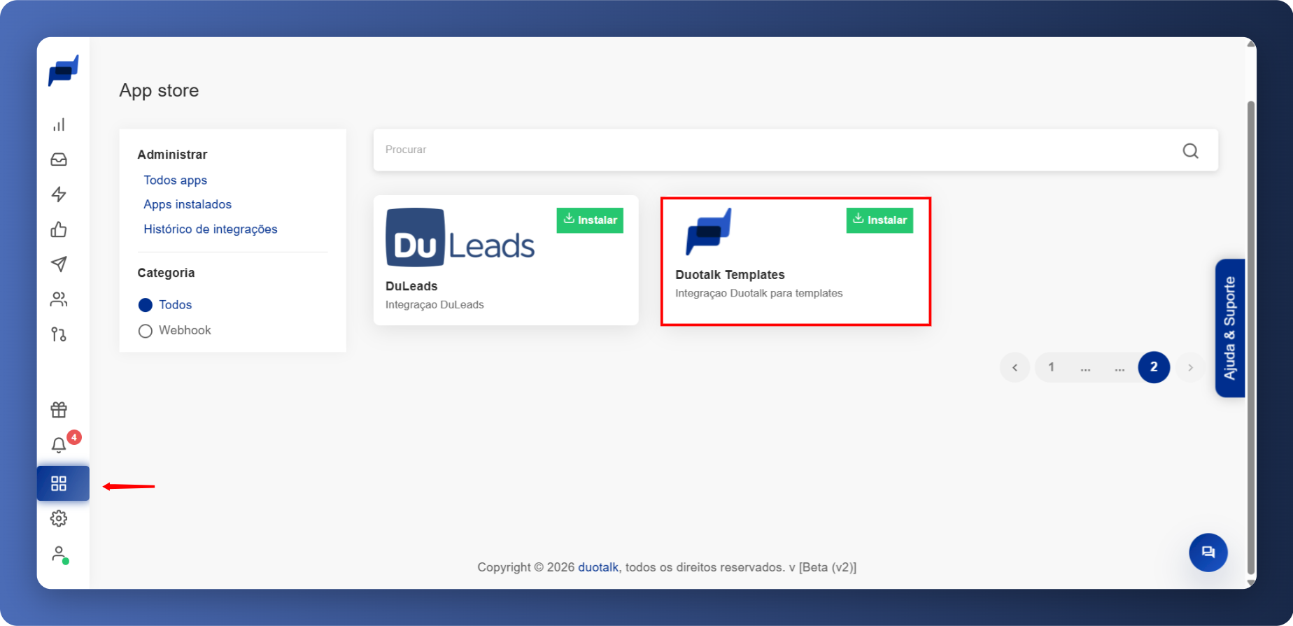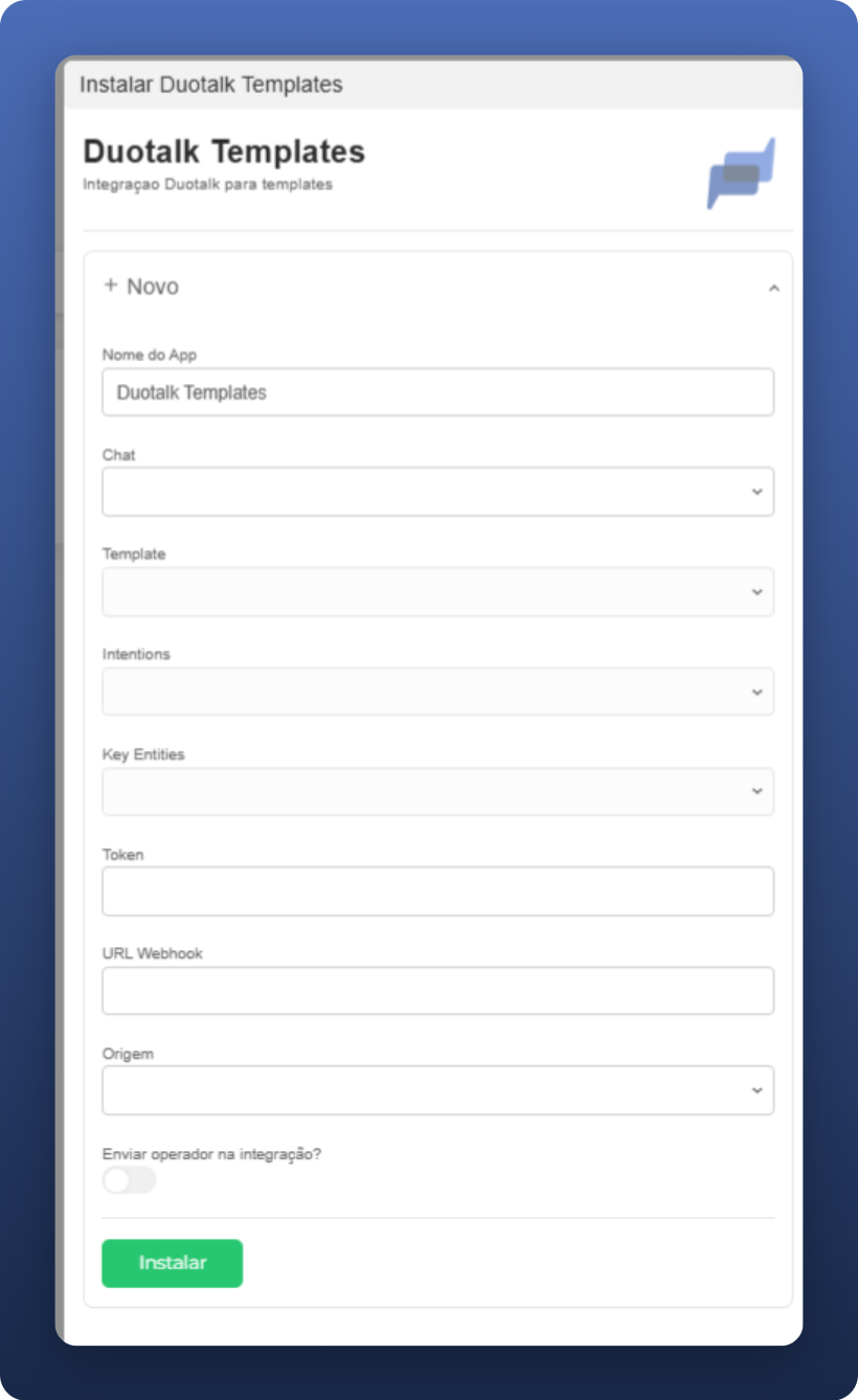Acesse: App Store → Integrações → Duotalk Templates → Instalar