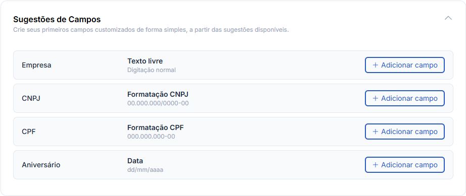 Existem sugestões de campos que servem para agilizar a criação dos primeiros campos customizados da conta.