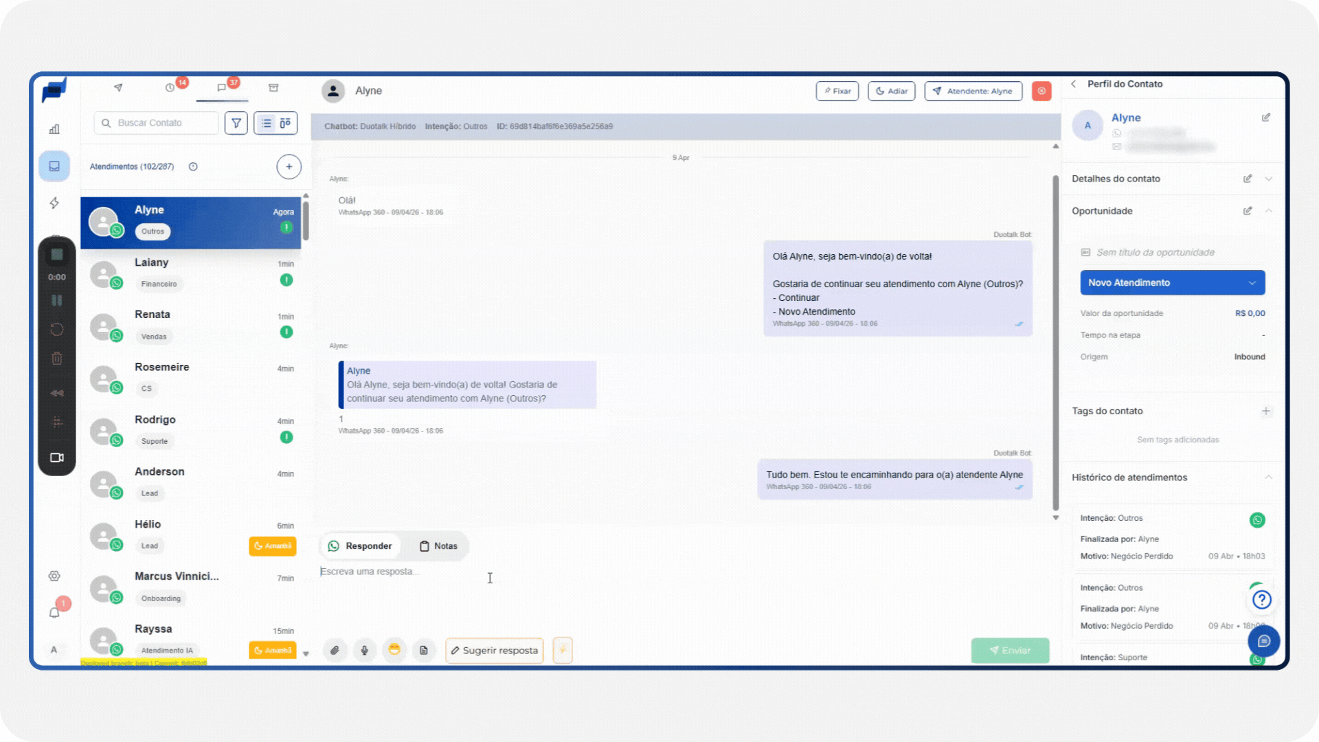 Durante um atendimento, é possível visualizar e atualizar informações relacionadas ao contato e à oportunidade, sem precisar trocar de tela.