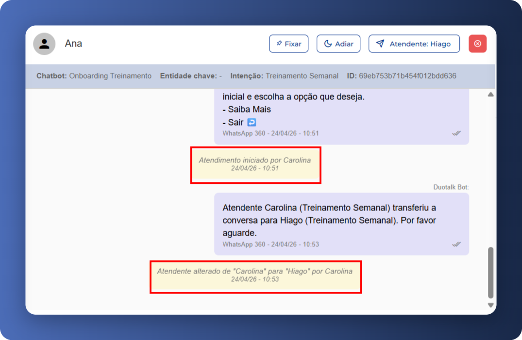 E, quando o contato está na aba de “Aguardando atendimento”, ainda não há um atendente vinculado. Nesse cenário, não existe histórico de responsável pelo atendimento e, consequentemente, ainda não há um evento de transferência válido a ser registrado.