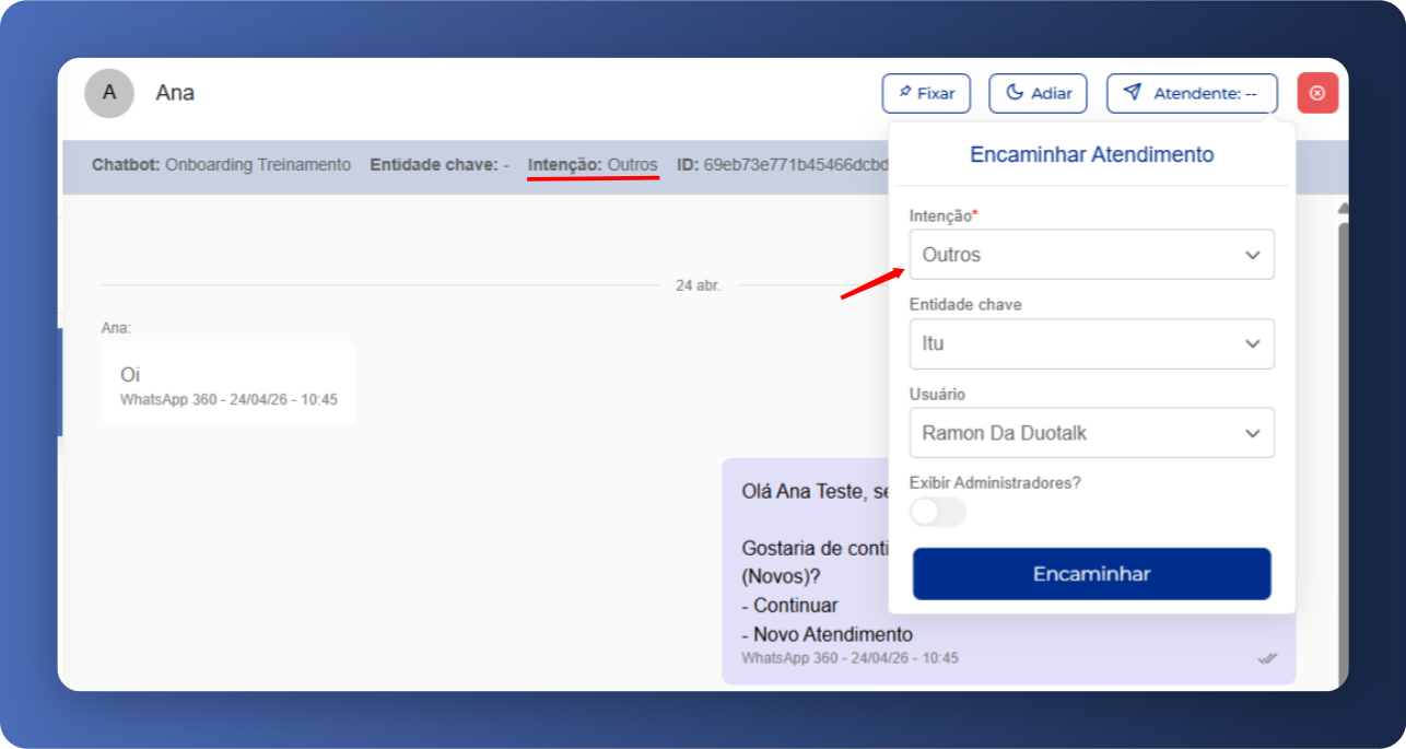 No exemplo abaixo, o chat estava na aba “Aguardando atendimento”, na intenção “Outros”, e o objetivo era alterá-la para “Atendimento”. Nesse cenário, não é necessário iniciar o chat, pois já existe o gatilho de mudança de intenção, suficiente para disparar a integração por transferência. Basta indicar diretamente a nova intenção e o atendente responsável. Vale reforçar que a intenção final precisa estar devidamente configurada no módulo de integração para que o processo ocorra como esperado.