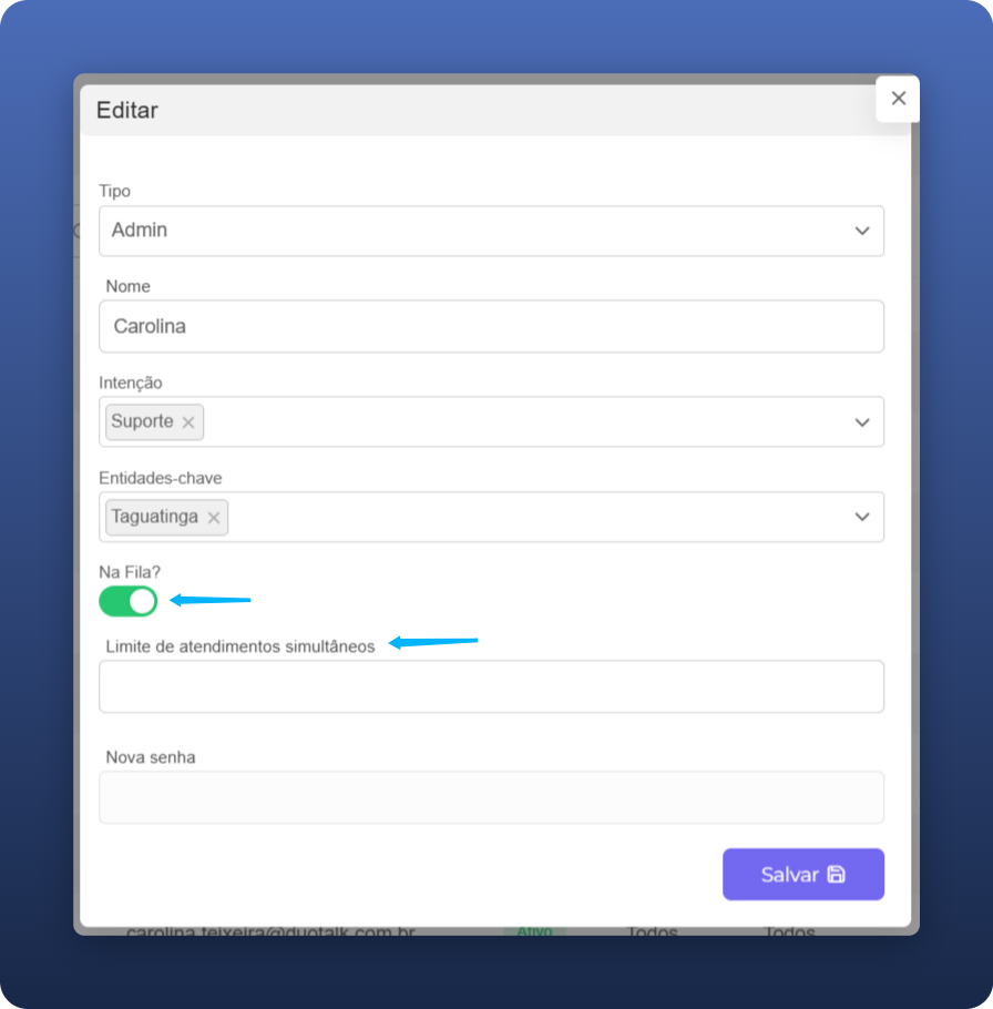 Caso o usuário seja colocado na fila de distribuição, aparecerá a opção de definir o limite de atendimentos simultâneos que este atendente poderá receber através da distribuição automática.