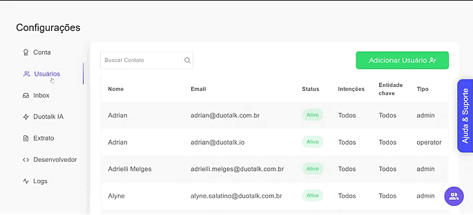Este é um guia com os passos para poder cadastrar sua Equipe no Duotalk. A primeira observação é que somente usuários com perfil Administrador consegue adicionar novos usuários. A partir disso é possível seguir os passos abaixo e cadastrar os usuários normalmente, mas caso tenha alguma questão, entre em contato com nossa equipe de Suporte pelo canal de Ajuda do Duotalk.