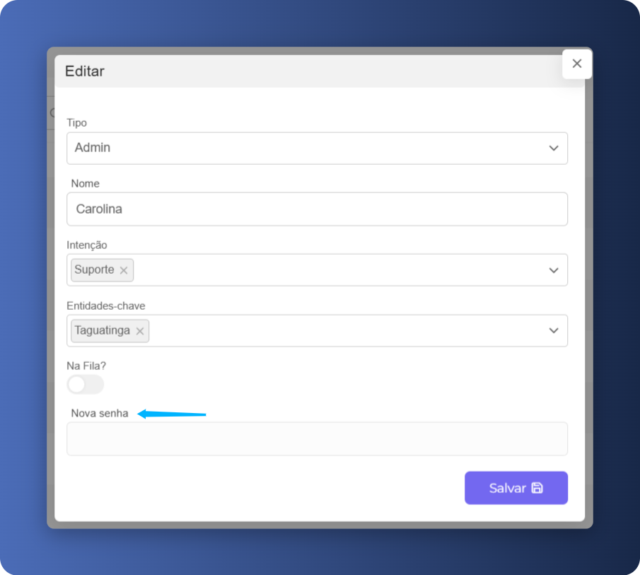 Sim, usuários com perfil de administrador podem resetar a senha de outros usuários. Para isso, basta acessar Configurações > Usuários, selecionar o usuário desejado, clicar em Editar e preencher o campo “Nova senha” com a senha que será definida.